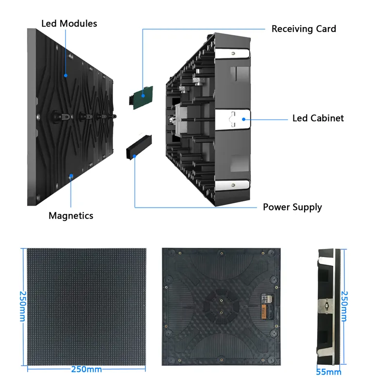 The LedManuf indoor advertising LED display has a perfect structural design. This diagram shows the front and rear views of the module, which helps to understand its structural layout more intuitively.Includes: 250x250mm LED modules, magnetics, receiving card, LED cabinet and power supply.